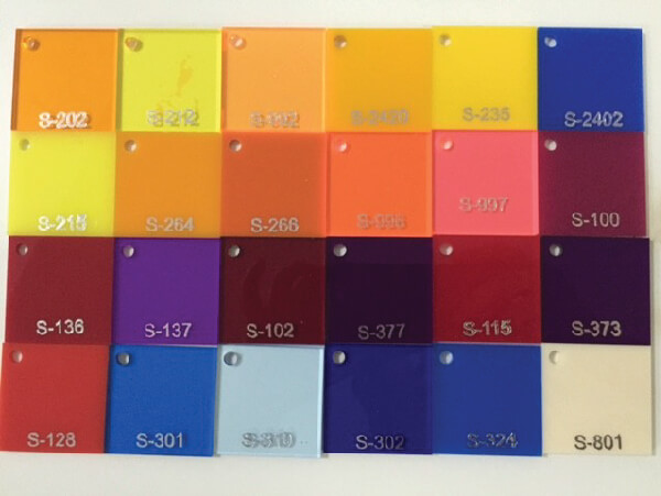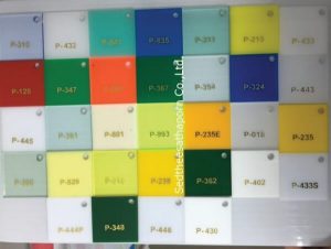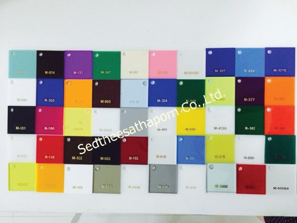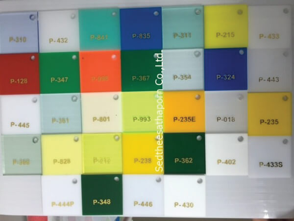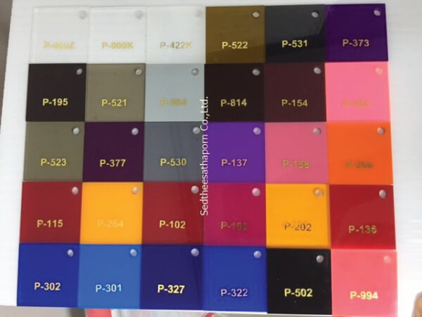- สีของวัสดุมีให้เลือกหลายหลากสี มีทั้งสีที่มีความโปร่งแสง สามารถดูรหัสสีอะคริลิคของได้เราเลย
